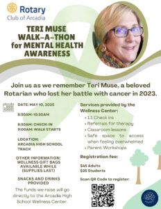 The Teri Muse Walk-A-Thon is an annual community walk hosted by the Rotary Club of Arcadia in memory of Teri Muse, a beloved Rotarian dedicated to mental health support. Participants walk to raise awareness and funds for the Arcadia High School Wellness Center, helping provide resources like one-on-one check-ins, counseling referrals, and classroom wellness programs for students.